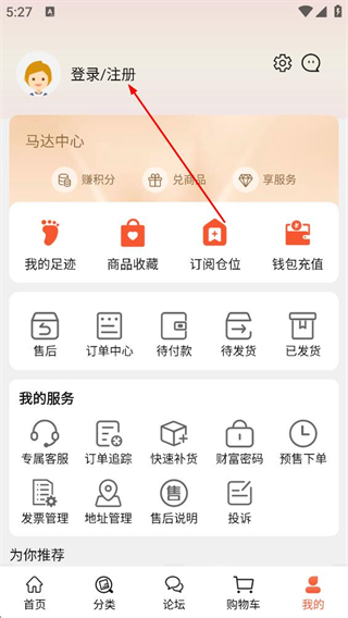 2、在个人中心页面,点击顶部的登录/注册选项,进入登录页面。