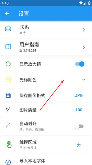 2、在设置页面找到光标颜色选项,点击该选项展开颜色选择的相关列表。