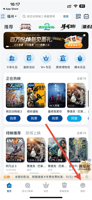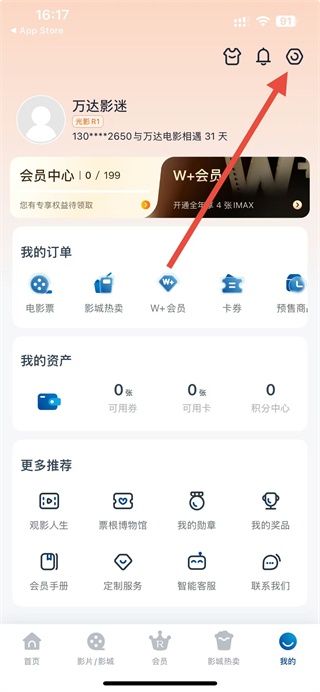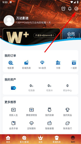 1、打开万达电影app,在首页点击右下角我的选项,进入个人页面。