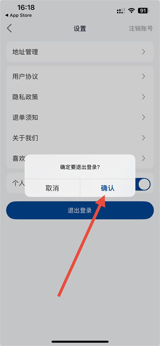 3、在设置页面中,找到退出登录按钮并点击,弹出退出确认的提示弹窗。