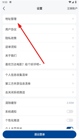 3、在设置页面,点击地址管理选项,进入收货地址页面。