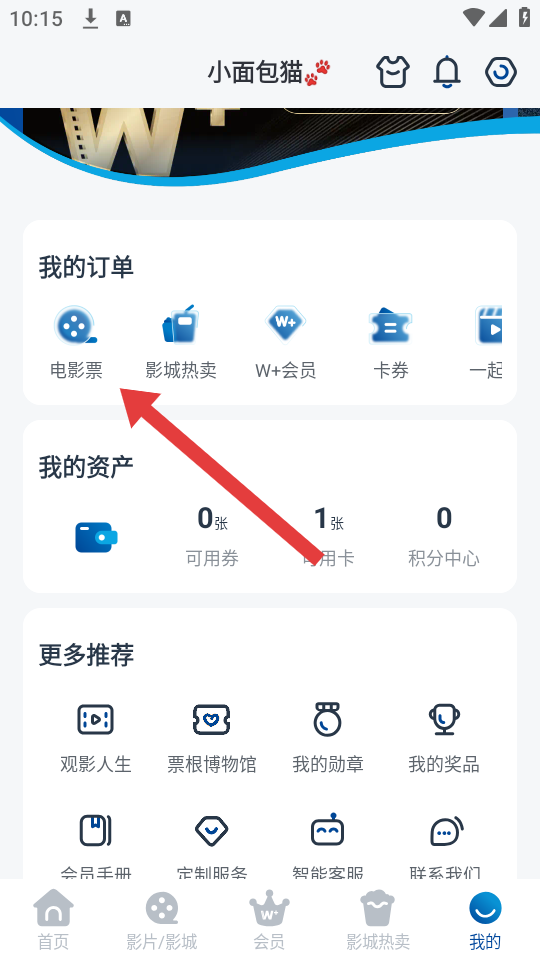 1、进入万达电影APP的我的页面,在我的订单模块中点击电影票选项,进入影票订单查询界面。