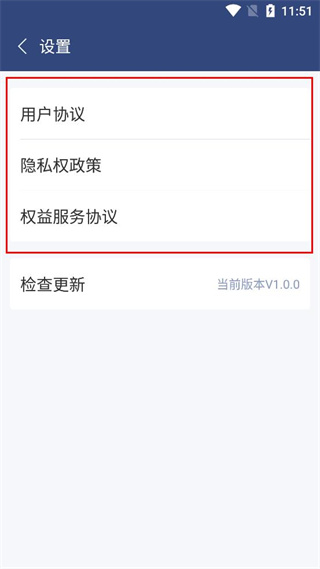 4、在设置界面可查看用户协议、隐私权政策等相关内容,完成设置操作。