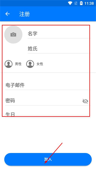 2、在注册页面依次填写名字、姓氏、选择性别,输入电子邮件、密码、生日等信息。