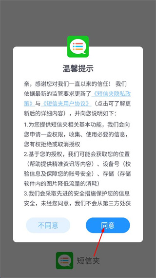 1、打开短信夹,阅读温馨提示内容,点击页面中的同意按钮进入软件。