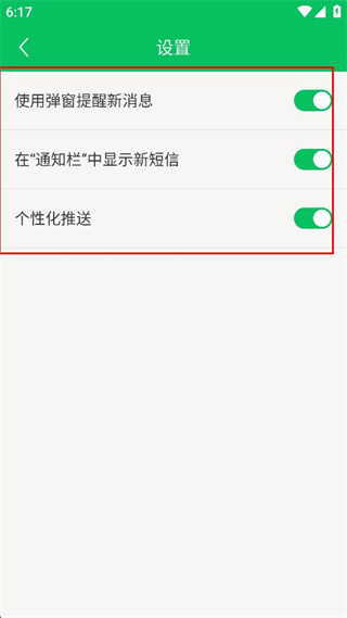 4、在设置页面里,可查看使用弹窗提醒新短信等通知相关的功能开关状态。