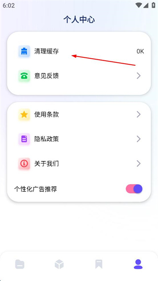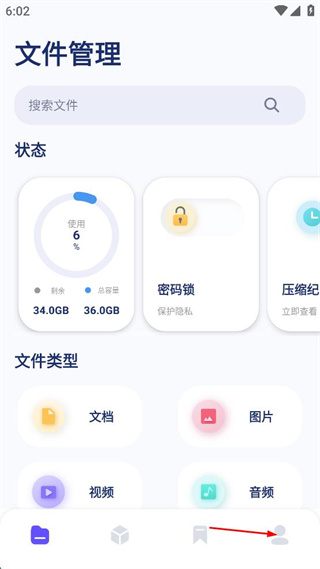 2、进入文件管理首页,找到页面底部的个人中心选项,点击该选项进入对应页面。