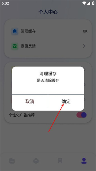 3、在个人中心页面中,找到清理缓存选项,点击该选项弹出是否清除缓存的提示。