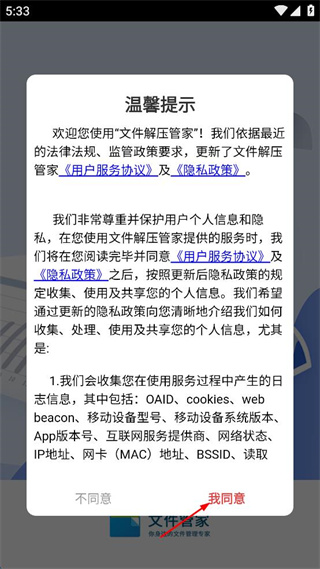 1、打开文件解压管家,阅读页面显示的温馨提示,同意用户服务协议及隐私政策。