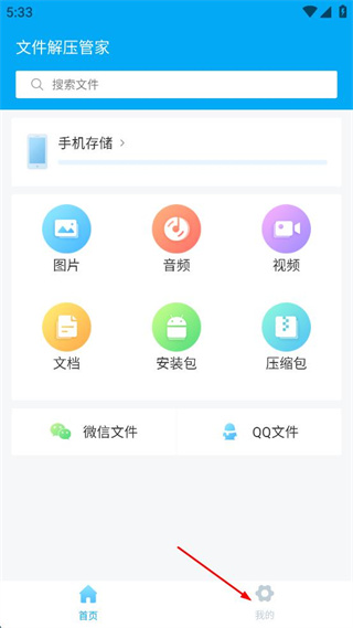 2、进入文件解压管家首页,找到页面底部的我的选项,点击该选项进入对应页面。