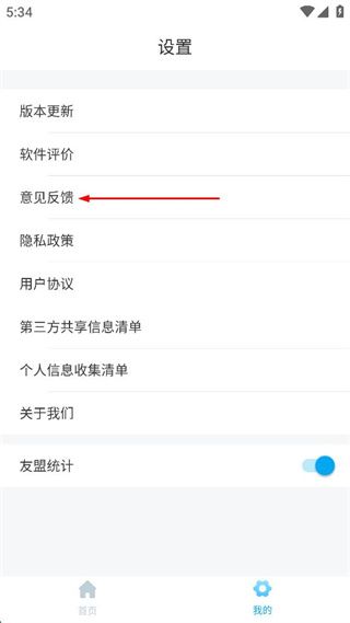 3、在我的页面中,找到设置选项并点击,进入设置页面后找到意见反馈选项并点击。