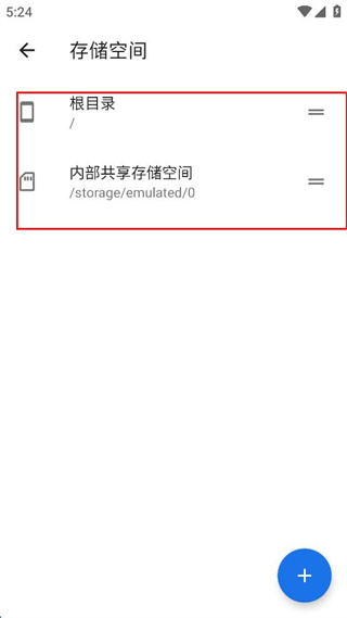 4、选择存储空间选项,进入页面查看根目录和内部共享存储空间的路径。