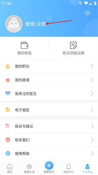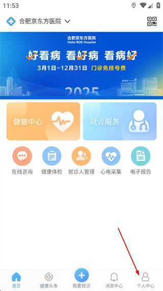 1、进入合肥京东方医院首页,找到底部导航栏的个人中心选项,点击该选项进入对应页面。
