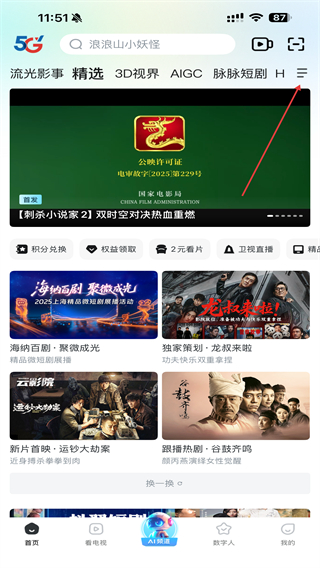 1、打开天翼超高清,点击首页右上角的菜单按钮,进入频道选择页面。
