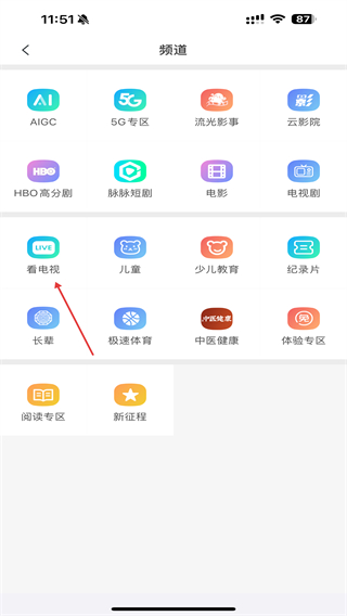 2、在频道页面中,找到并点击看电视选项,进入电视直播相关页面。