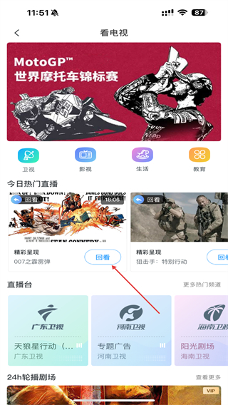 3、在看电视页面内,找到需要查看回放的直播内容,点击回看即可。