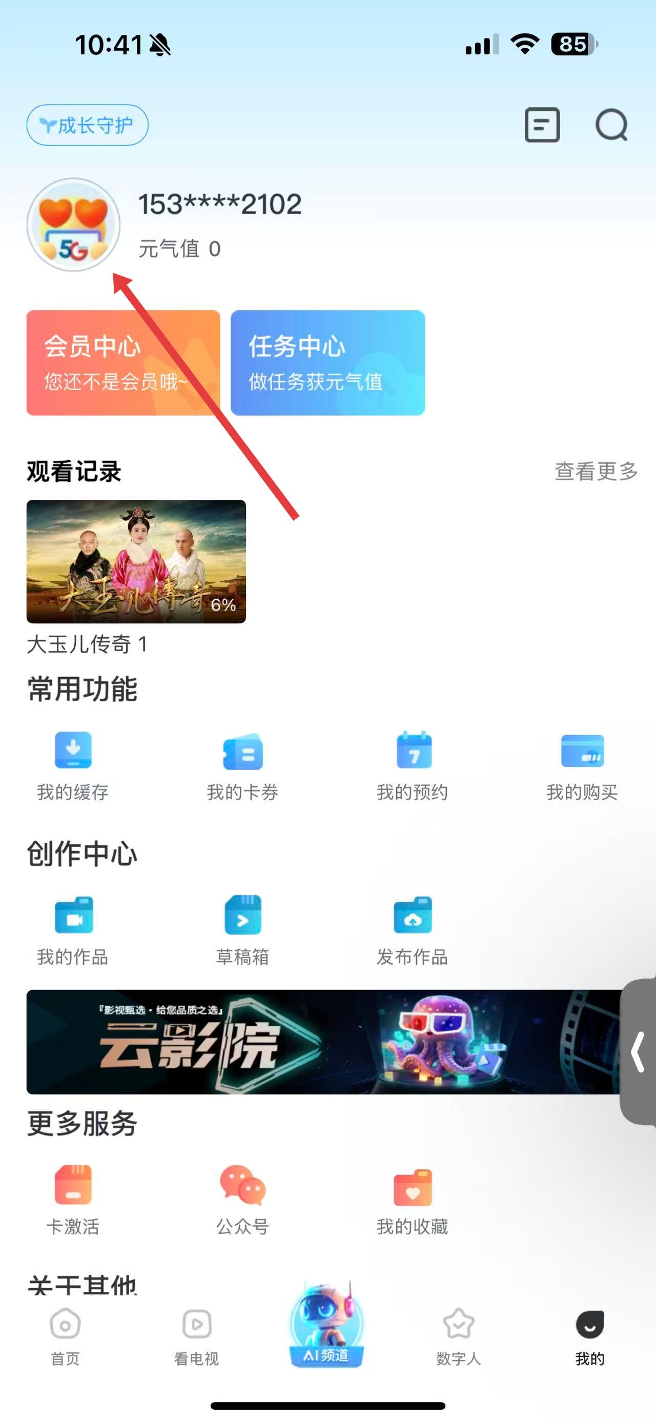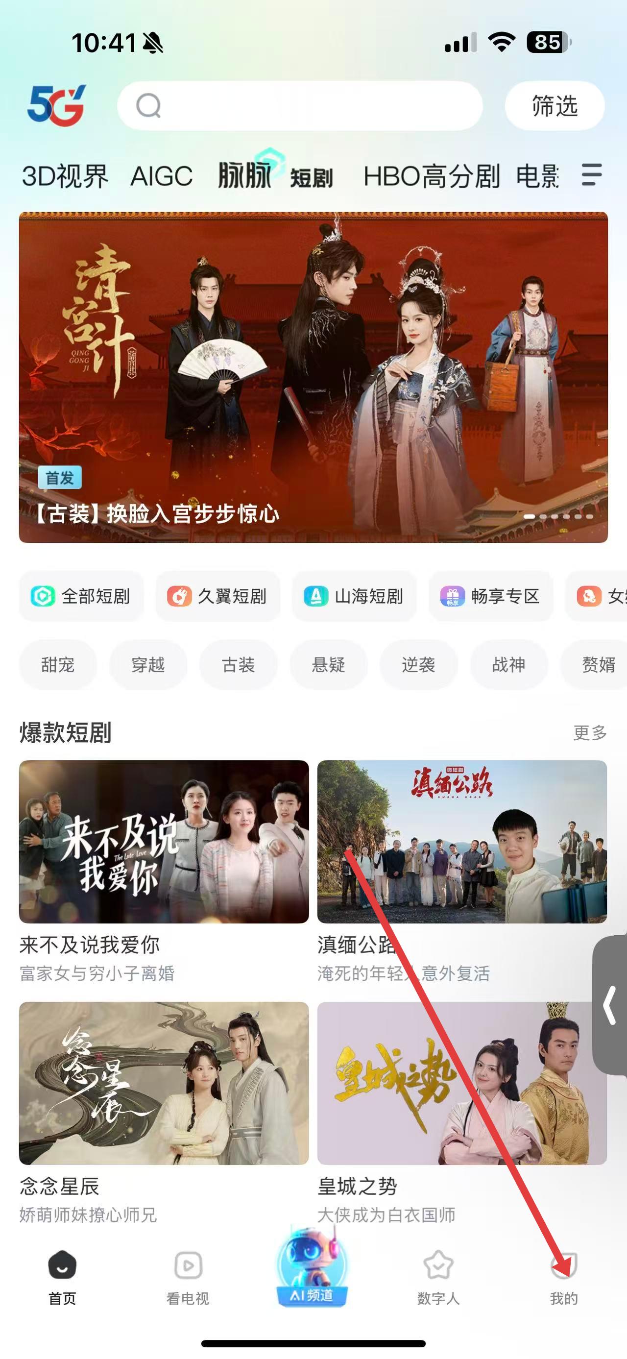 1、打开天翼超高清应用,点击底部导航栏最右侧的我的选项,进入个人页面。