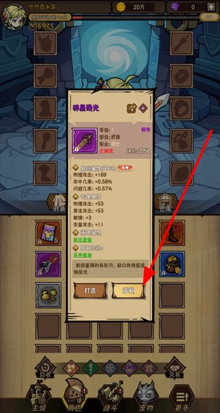 4、进入角色界面查看获得的装备,选择装备后点击穿戴按钮,就能给角色换上该装备,提升角色属性。