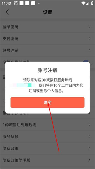 4、在弹出的账号注销提示框中,按照指引联系对应BD或拨打服务热线,完成账号注销申请