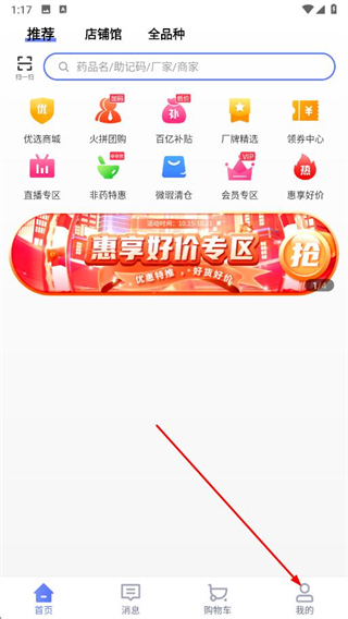 1、打开1药城app的我的页面,点击右下角的我的。