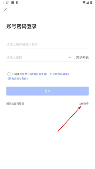 3、在账号密码登录页面,点击右下角注册账号选项。