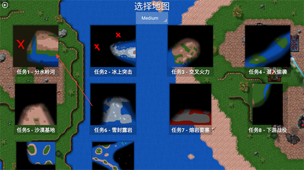 2、选择对应任务地图,如任务1-分水岭河开启战役,也可选多人游戏与其他玩家联机对战。