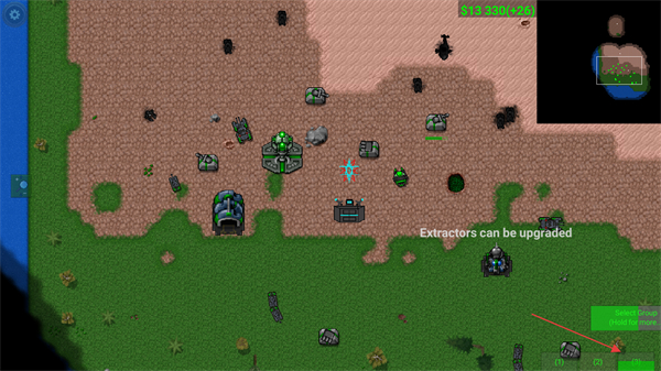 3、进入关卡后,先造资源提取器获取金币,升级提取器提升产能,为后续造兵做基础准备。