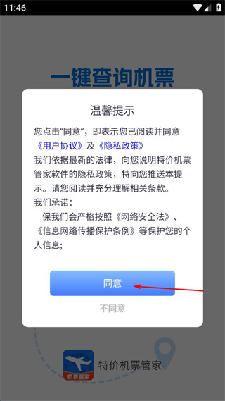 1、阅读温馨提示中的用户协议及隐私政策,点击同意按钮进入主界面。