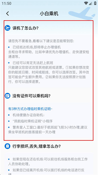 4、在对应页面中,查看误机处理、证件办理等小白乘机相关的指引信息。