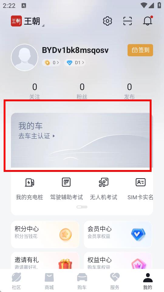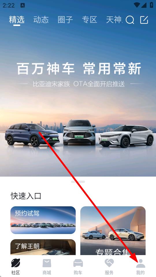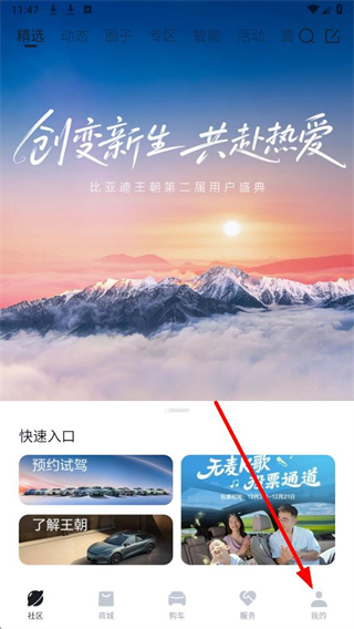 1、在比亚迪界面,点击底部的社区选项,进入社区相关页面。