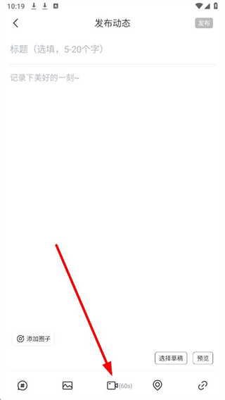 3、在发布动态界面,点击底部的视频图标,编辑内容后,点击右上角的发布按钮。