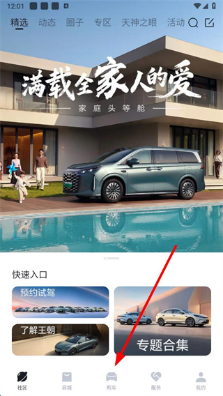 1、打开比亚迪app,点击下方购车选项,进入购车页面。