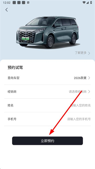 5、选择经销商、填写姓名和手机号后,点击立即预约即可完成试驾预约。