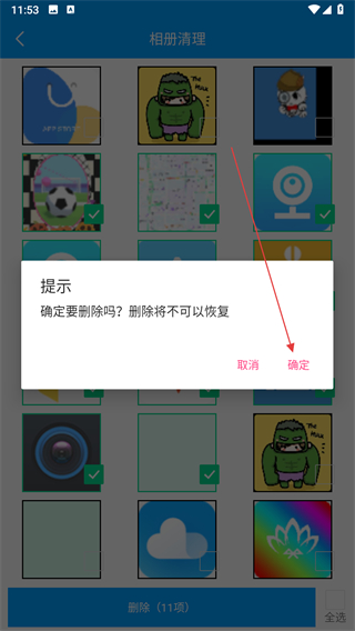 4、在弹出的删除提示框中点击确定按钮,完成选中相册图片的清理操作。