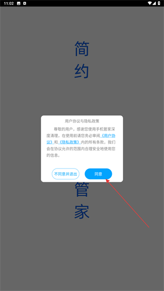 1、打开手机管家深度清理APP,进入时会弹出用户协议与隐私政策,点击同意的按钮。