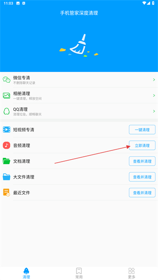 2、在首页内,找到音频清理并点击右侧立即清理的按钮。