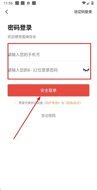 3、在登录页面填写手机号和密码,勾选协议后,点击安全登录完成账号登录操作。