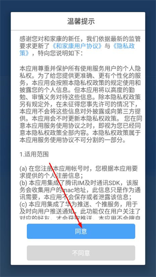 1、打开和家康app,在弹出的温馨提示弹窗中点同意,进入登录页面。