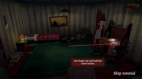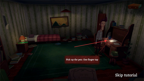 1、按提示Pickupthepen:Onefingertap,用单指点击桌上的笔,拾取该物品。