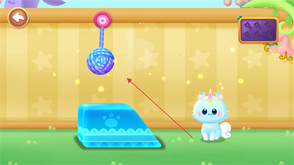 1、观察场景,看到毛线球悬挂着,还有小猫和蓝色平台,需规划互动步骤。