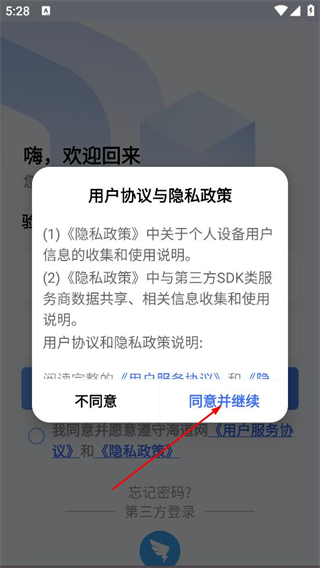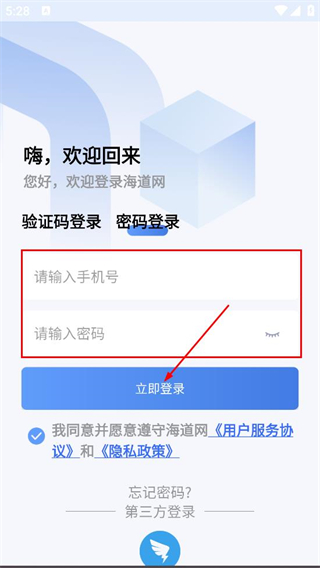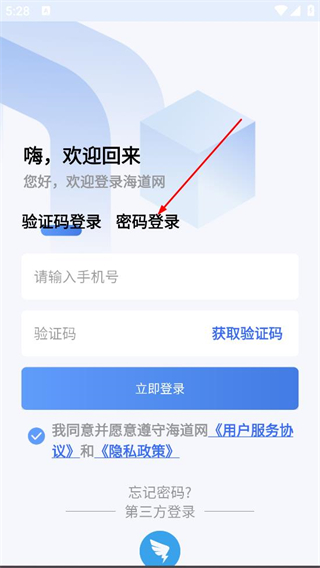 1、在海道网的用户协议和隐私政策弹窗中,点击同意,进入登录页面。