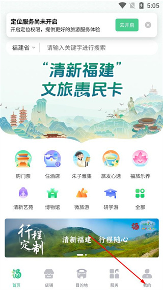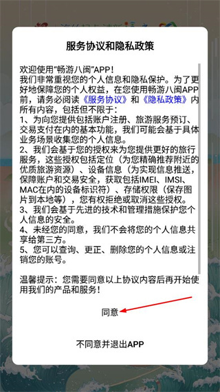 1、打开畅游八闽应用,看到服务协议和隐私政策弹窗,点击弹窗中的同意按钮,进入应用主页面。