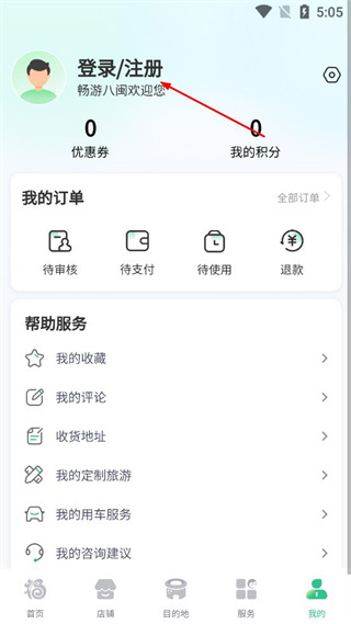 3、在个人中心页面,找到登录/注册区域,点击该区域,进入登录信息填写页面。