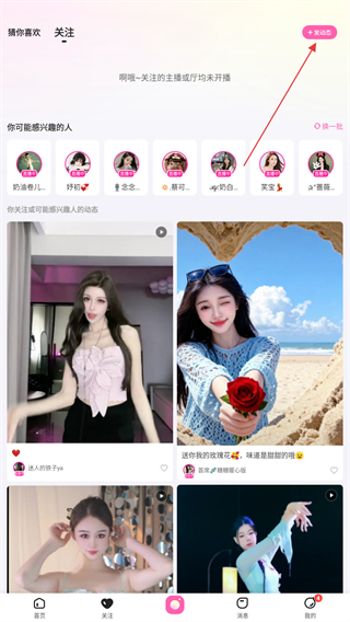 2、进入关注的页面内,点击右侧|+发动态的按钮。