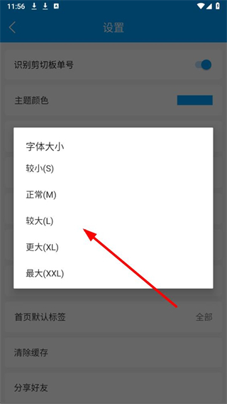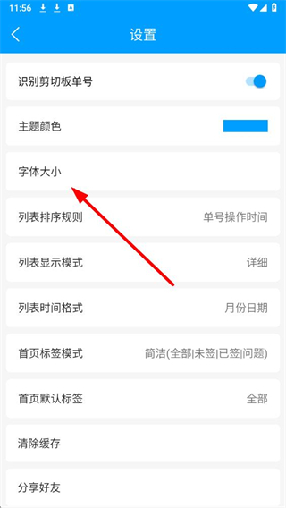 3、在设置页面里,选择字体大小选项并点击,弹出包含不同字体尺寸的选择菜单。