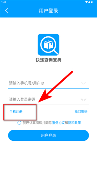 3、在用户登录页面点击手机注册,进入手机注册页面。