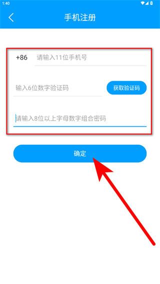 4、在手机注册页面填写手机号、获取并输入验证码、设置密码,点击确定,完成账号注册。
