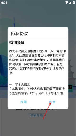 1、打开西安公交出行APP,查看弹出的隐私协议内容,确认后点击同意按钮进入主界面。