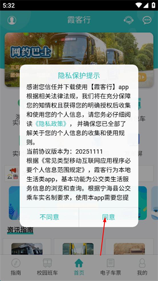 1、打开霞客行软件,在弹出的隐私保护提示页面阅读内容,然后点击同意按钮。
