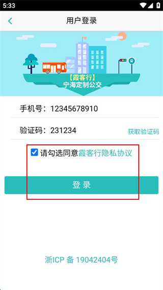 4、勾选请勾选同意霞客行隐私协议,然后点击登录按钮,完成霞客行软件的登录。